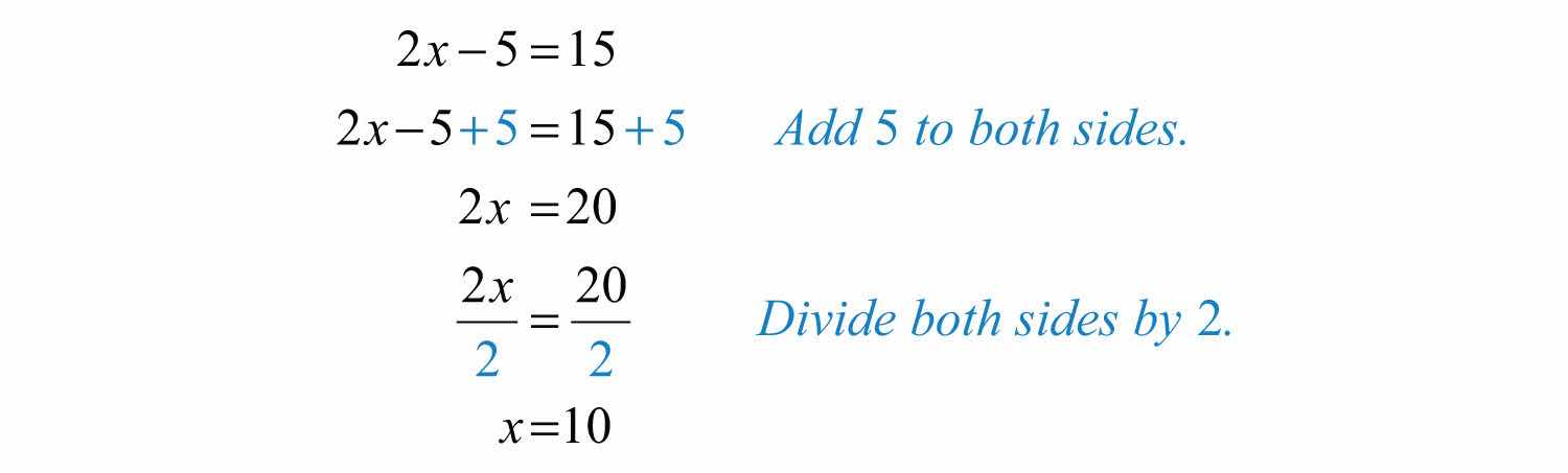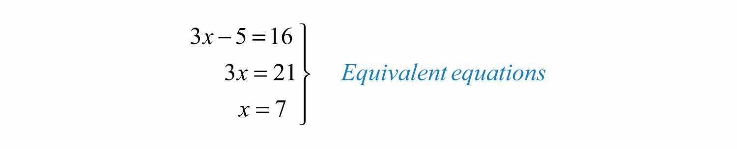 Here we can see that the two linear equations and are equivalent because they share the same solution set, namely, {7}. The goal is to develop a systematic process to find equivalent equations until the variable is isolated: