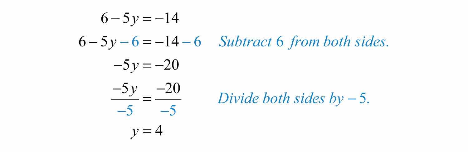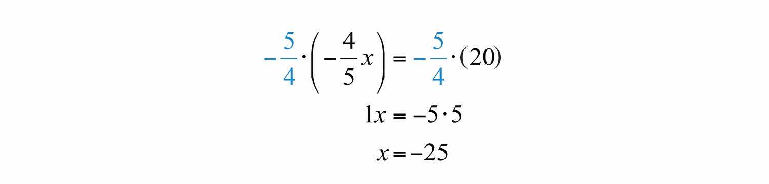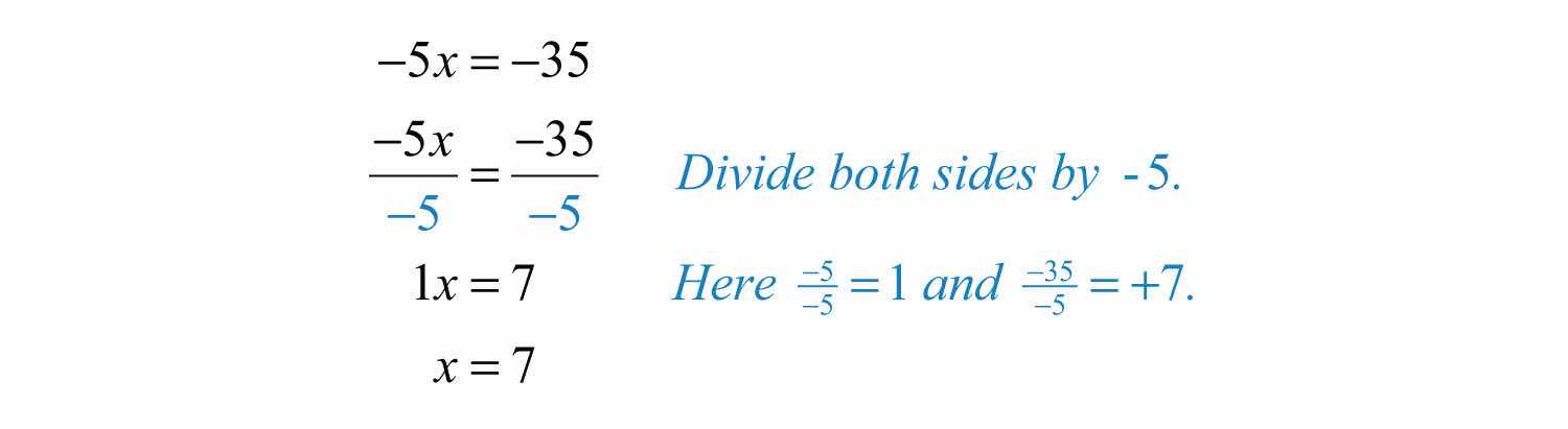 In the previous example, after dividing both sides by −5, x is left with a coefficient of 1, because . In fact, when we say “isolate the variable,” we mean to change the coefficient of the variable to 1, because is equivalent to . This step is often left out of the instructional examples even though its omission is sometimes a source of confusion.