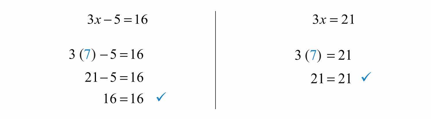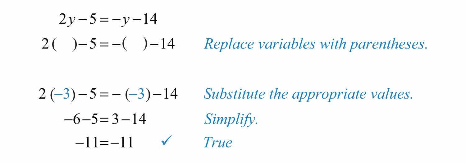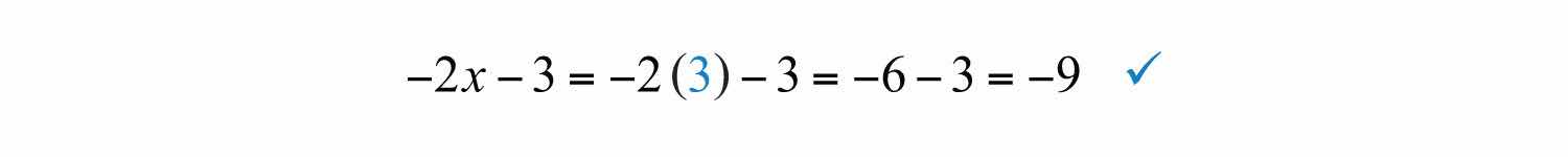Alternatively, when an equation is equal to a constant, we can verify a solution by substituting the value for the variable and show that the result is equal to that constant. In this sense, we say that solutions satisfy the equationAfter replacing the variable with a solution and simplifying, it produces a true statement..