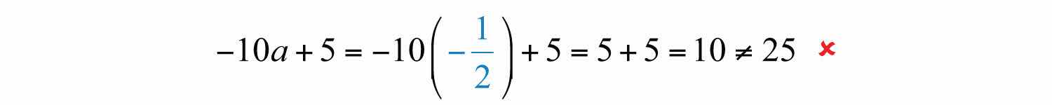 A solutionAny value that can replace the variable in an equation to produce a true statement. to a linear equation is any value that can replace the variable to produce a true statement. The variable in the linear equation is x, and the solution is . To verify this, substitute the value 5 for x and check that you obtain a true statement.
