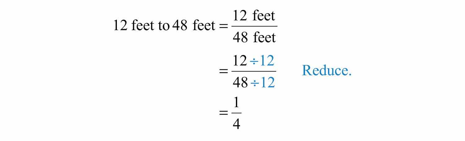 Example 1: Express the ratio 12 feet to 48 feet in reduced form.