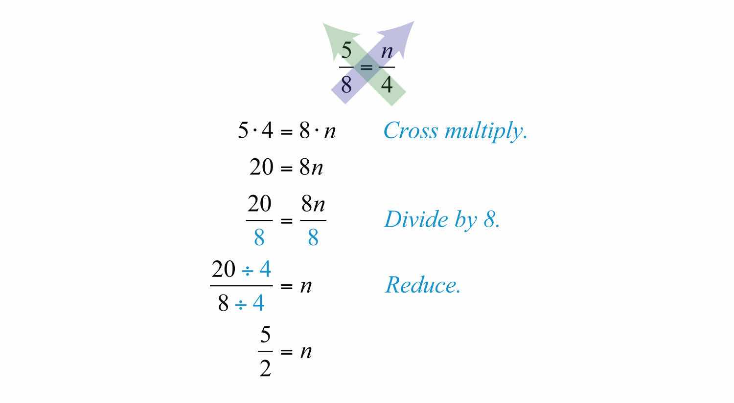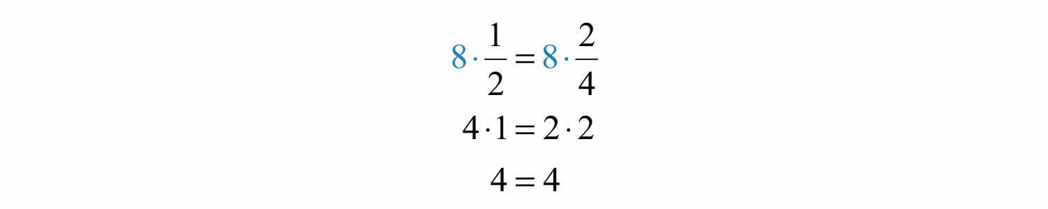 If we clear the fractions by multiplying both sides of the proportion by the product of the denominators, 8, then we obtain the following true statement: