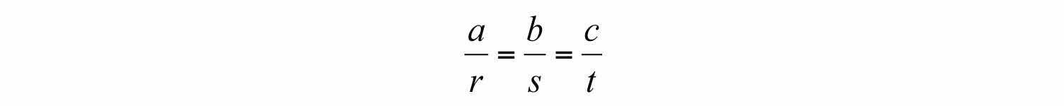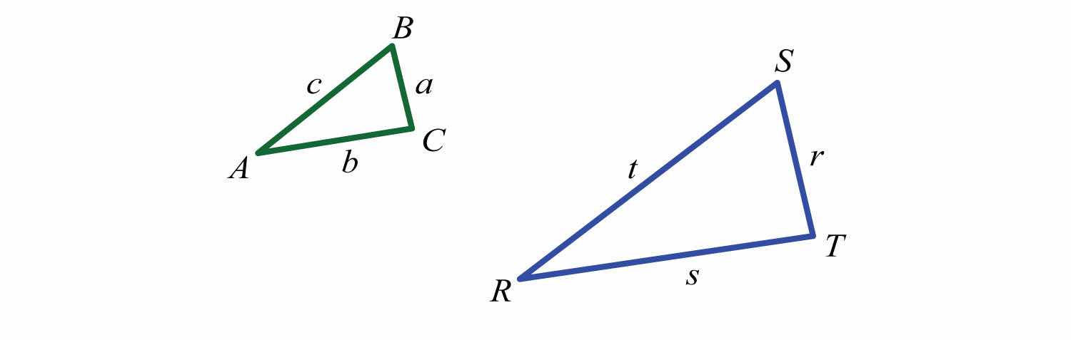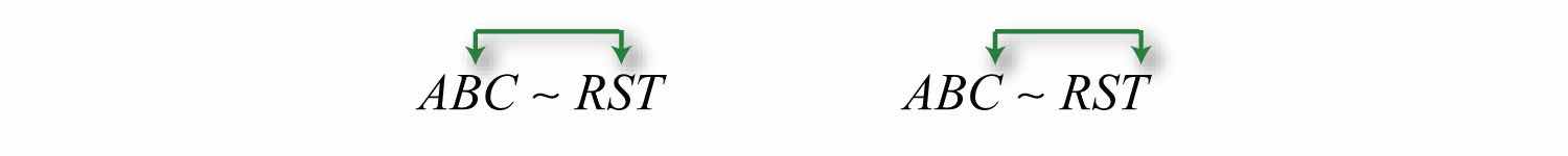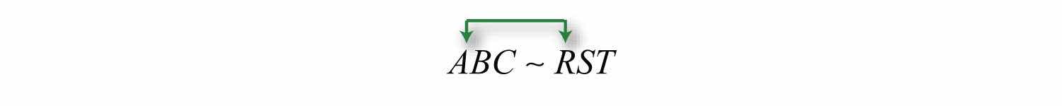 We will often encounter proportion problems in geometry and trigonometry. One application involves similar trianglesTriangles with the same shape but not necessarily the same size. The measures of corresponding angles are equal and the corresponding sides are proportional., which have the same shape, but not necessarily the same size. The measures of the corresponding angles of similar triangles are equal, and the measures of the corresponding sides are proportional. Given similar triangles ABC and RST,