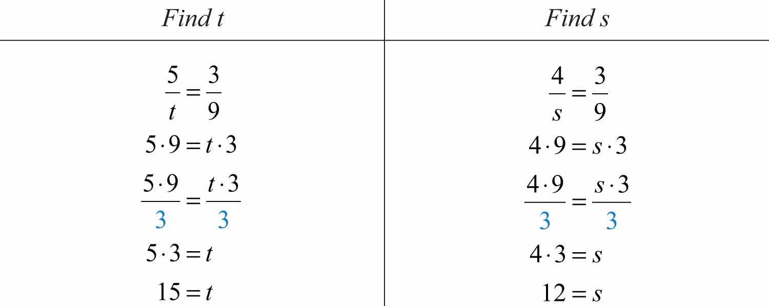 Solution: Draw a picture and identify the variables pictorially. Represent the remaining unknown sides by s and t. Set up proportions and solve for the missing sides.