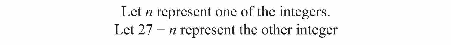 Solution: The sum of two integers is 27; use this relationship to avoid two variables.