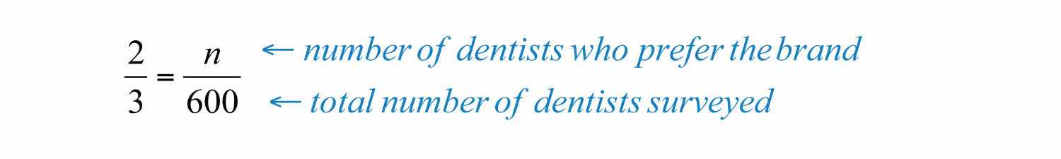 Since you are looking for the number of dentists who prefer the brand name out of a total of 600 surveyed, construct the ratios with the number of dentists who prefer the brand in the numerator and the total number surveyed in the denominator.