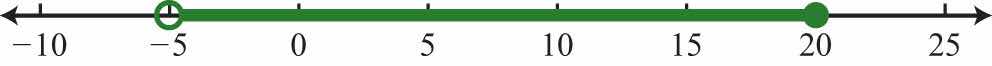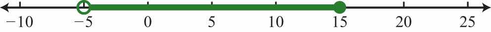 Solution: Shade all real numbers between −5 and 15, and indicate that the upper bound, 15, is included in the solution set by using a closed dot.