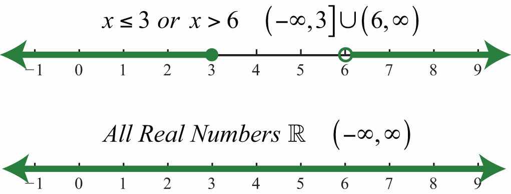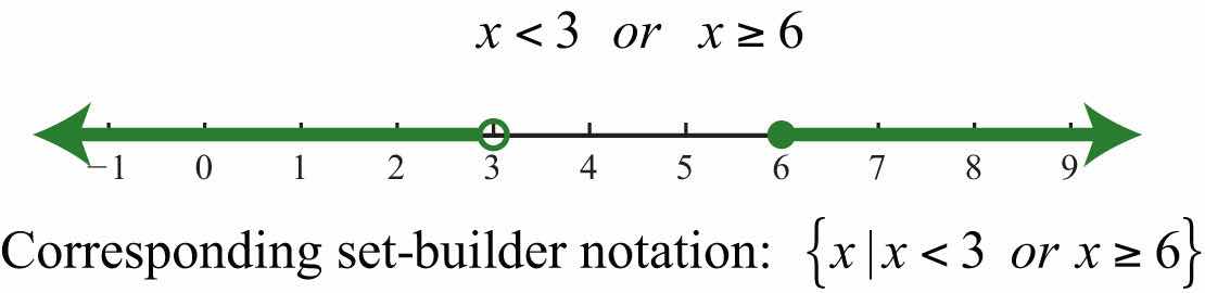 To describe compound inequalities such as , write , which is read “the set of all real numbers x such that x is less than 3 or x is greater than or equal to 6.”