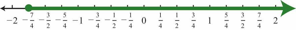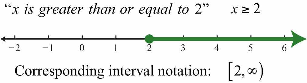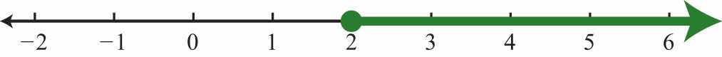 Determine the interval notation after graphing the solution set on a number line. The numbers in interval notation should be written in the same order as they appear on the number line, with smaller numbers in the set appearing first. In this example, there is an inclusive inequalityAn inequality that includes the boundary point indicated by the “or equal” part of the symbols and and a closed dot on the number line., which means that the lower-bound 2 is included in the solution. Denote this with a closed dot on the number line and a square bracket in interval notation. The symbol (∞) is read as infinityThe symbol (∞) indicates the interval is unbounded to the right. and indicates that the set is unbounded to the right on a number line. Interval notation requires a parenthesis to enclose infinity. The square bracket indicates the boundary is included in the solution. The parentheses indicate the boundary is not included. Infinity is an upper bound to the real numbers, but is not itself a real number: it cannot be included in the solution set.