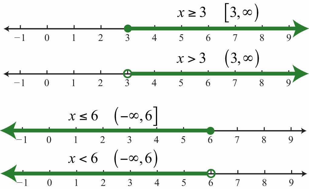 To express the solution graphically, draw a number line and shade in all the values that are solutions to the inequality. Interval notation is textual and uses specific notation as follows: