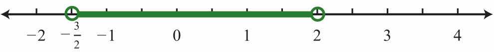Alternatively, we may interpret as all possible values for x between or bounded by −1 and 3 on a number line. For example, one such solution is . Notice that 1 is between −1 and 3 on a number line, or that −1 < 1 < 3. Similarly, we can see that other possible solutions are −1, −0.99, 0, 0.0056, 1.8, and 2.99. Since there are infinitely many real numbers between −1 and 3, we must express the solution graphically and/or with interval notation, in this case .