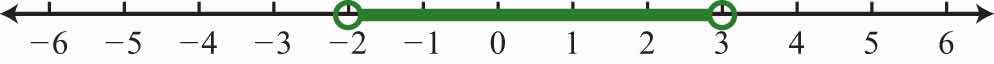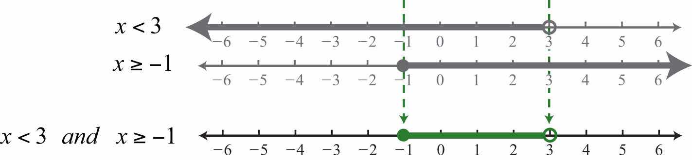 Solution: Determine the intersection, or overlap, of the two solution sets. The solutions to each inequality are sketched above the number line as a means to determine the intersection, which is graphed on the number line below.
