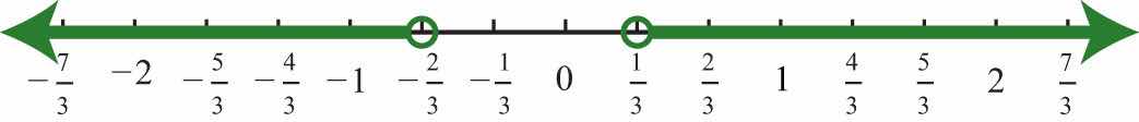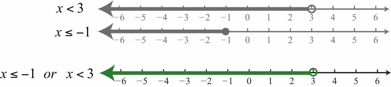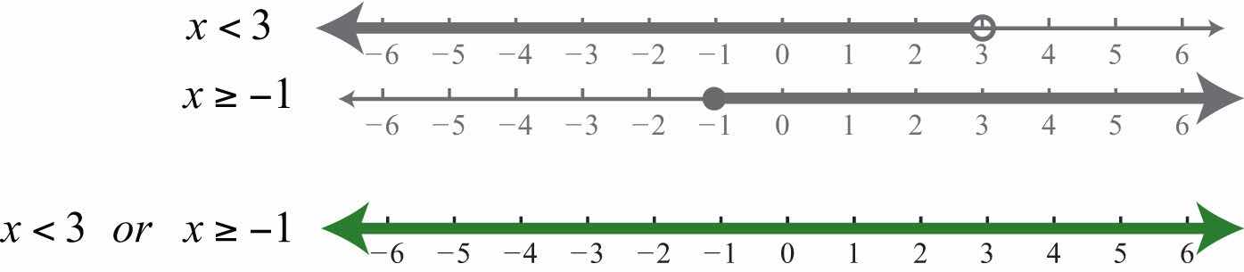 Solution: Combine all solutions of both inequalities. The solutions to each inequality are sketched above the number line as a means to determine the union, which is graphed on the number line below.