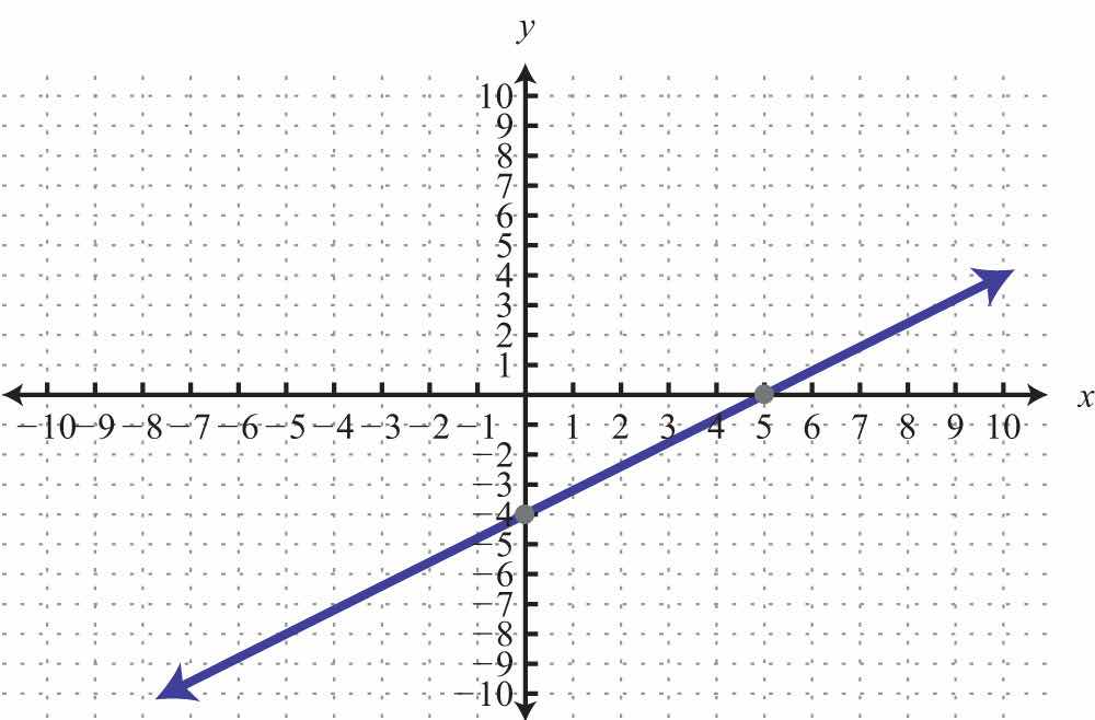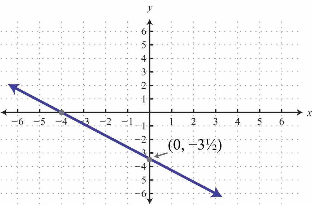 To summarize, any linear equation can be graphed by finding two points and connecting them with a line drawn with a straightedge. Two important and useful points are the x- and y-intercepts; find these points by substituting y = 0 and x = 0, respectively. This method for finding intercepts will be used throughout our study of algebra.
