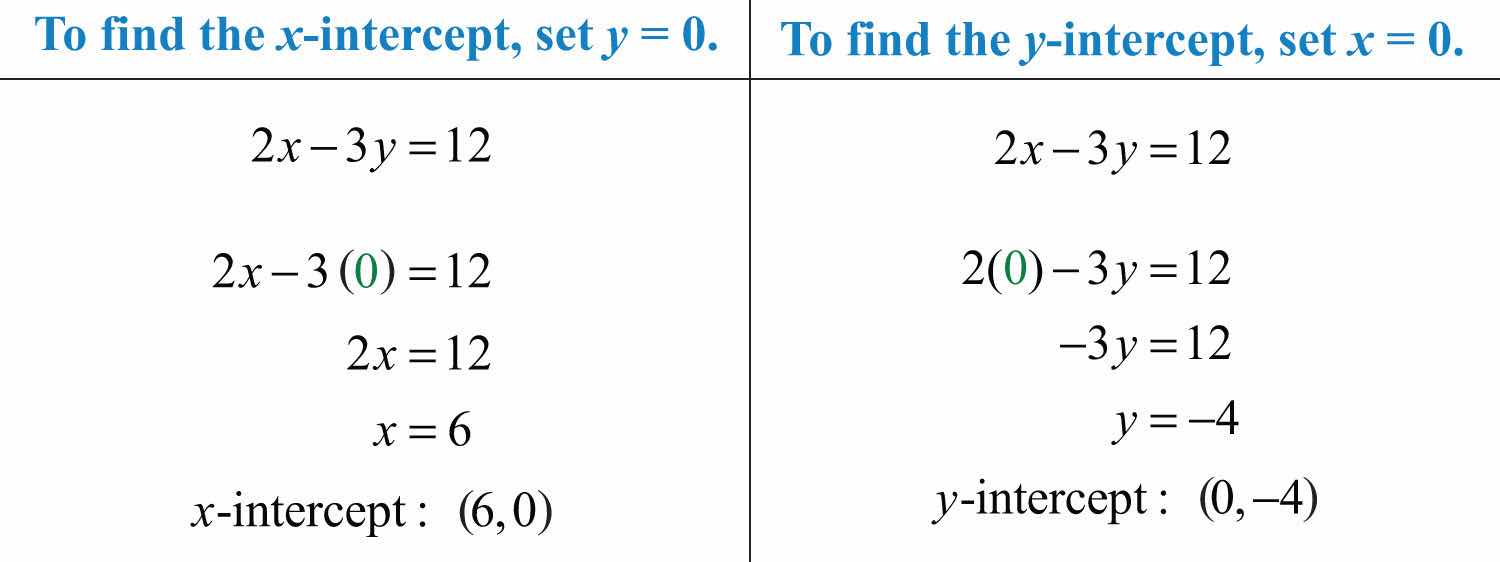 Since two points determine a line, we can use the x- and y-intercepts to graph linear equations. We have just outlined an easy method for finding intercepts; now we outline the steps for graphing lines using the intercepts.