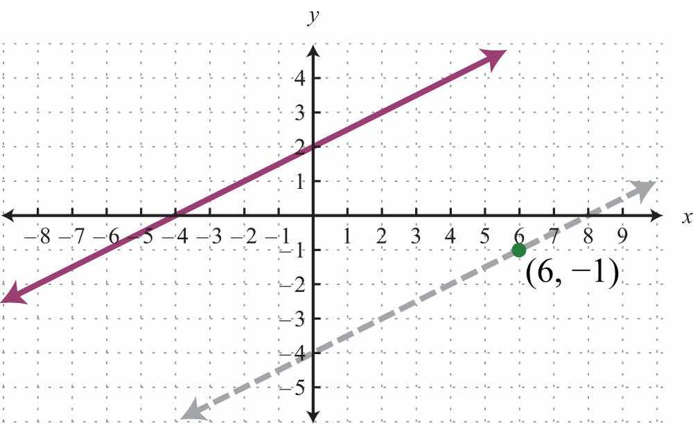 Through the point (6, −1) we found a parallel line, , shown dashed. Notice that the slope is the same as the given line, but the y-intercept is different. If we keep in mind the geometric interpretation, then it will be easier to remember the process needed to solve the problem.