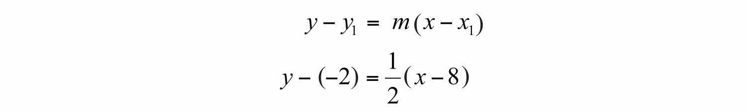 Step 2: Substitute the slope you found and the given point into the point-slope form of an equation for a line. In this case, the slope is and the given point is (8, −2).