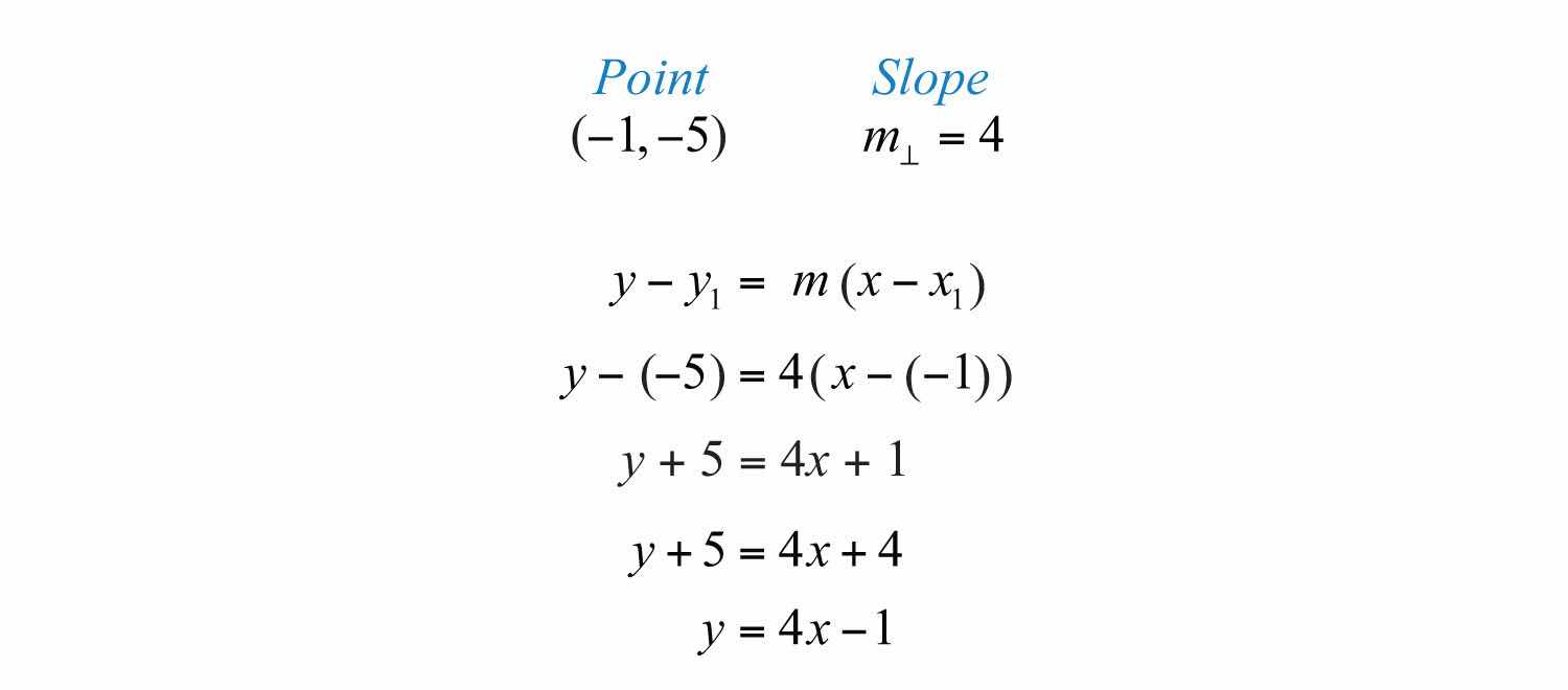 Example 4: Find the equation of the line passing through (−1, −5) and perpendicular to .