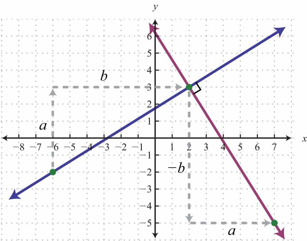 Geometrically, we note that if a line has a positive slope, then any perpendicular line will have a negative slope. Furthermore, the rise and run between two perpendicular lines are interchanged.