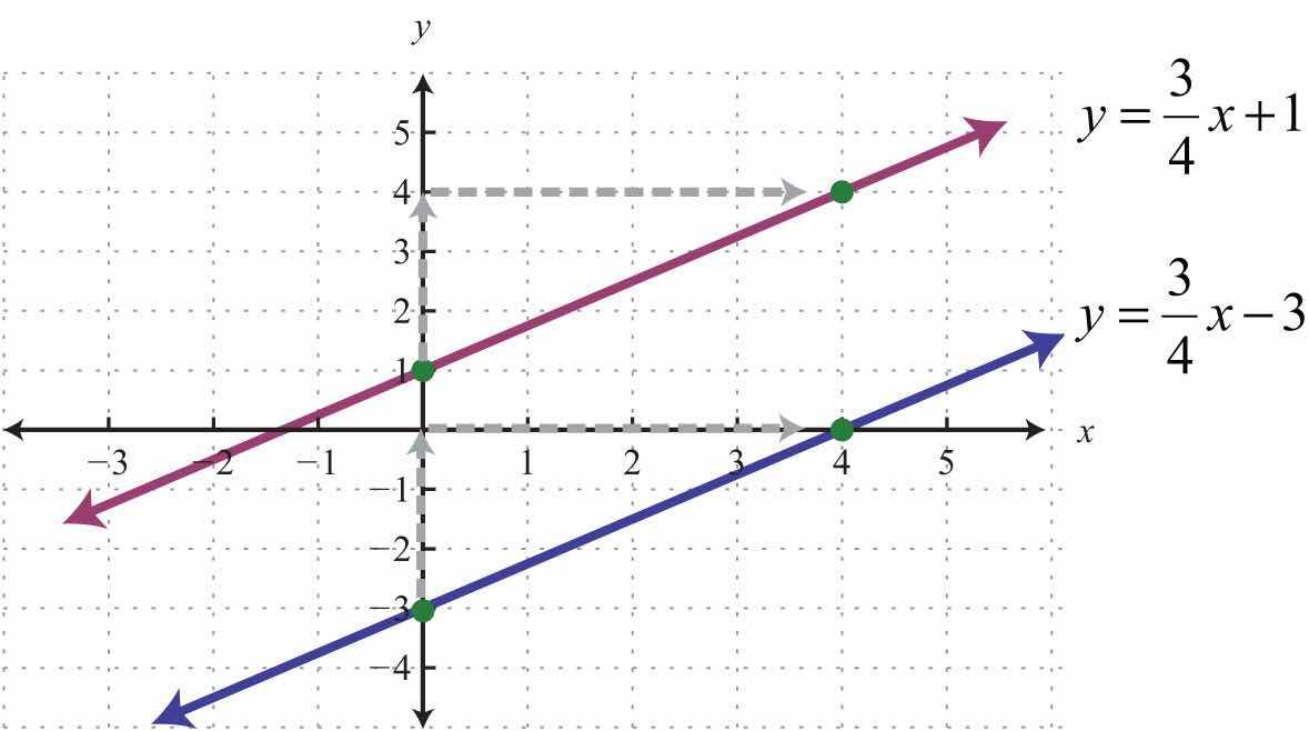 Parallel linesLines in the same plane that do not intersect; their slopes are the same. are lines in the same plane that never intersect. Two nonvertical lines in the same plane, with slopes and , are parallel if their slopes are the same, . Consider the following two lines: