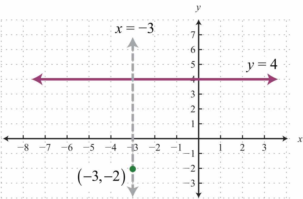 Equations of vertical lines look like . Since it must pass through (−3, −2), we conclude that is the equation. All ordered pair solutions of a vertical line must share the same x-coordinate.