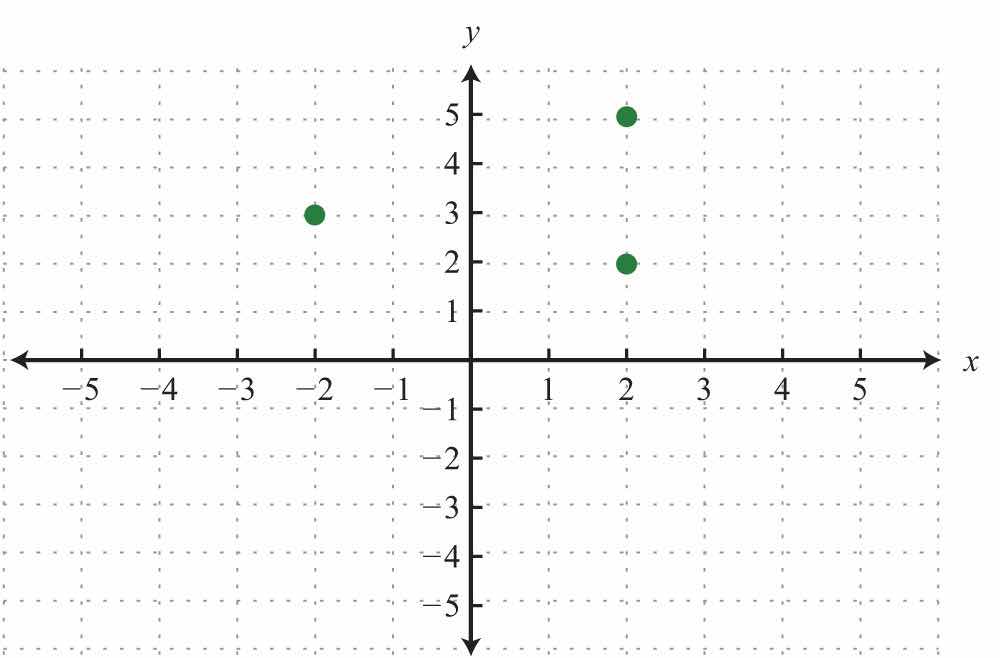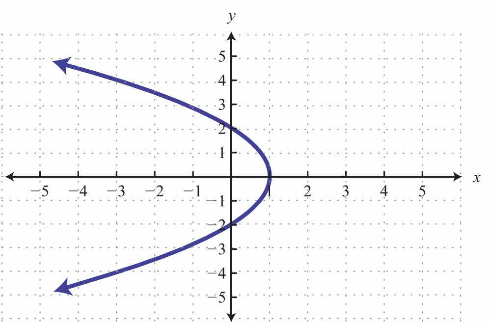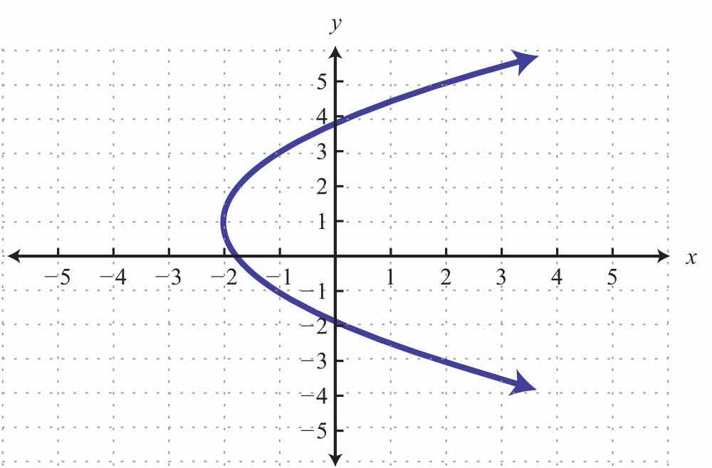 Here the graph represents a relation where many x-values in the domain correspond to two y-values. If we draw a vertical line, as illustrated, we can see that (3, 2) and (3, −2) are two ordered pairs with the same x-value. Therefore, the x-value 3 corresponds to two y-values; hence the graph does not represent a function. The illustration suggests that if any vertical line intersects a graph more than once, then the graph does not represent a function. This is called the vertical line testIf a vertical line intersects a graph more than once, then the graph does not represent a function..