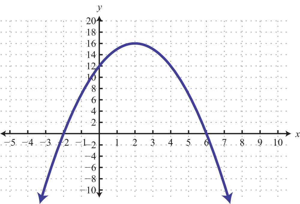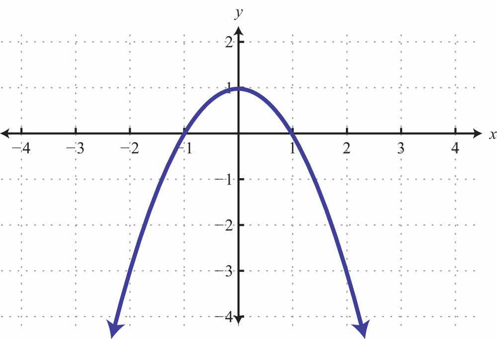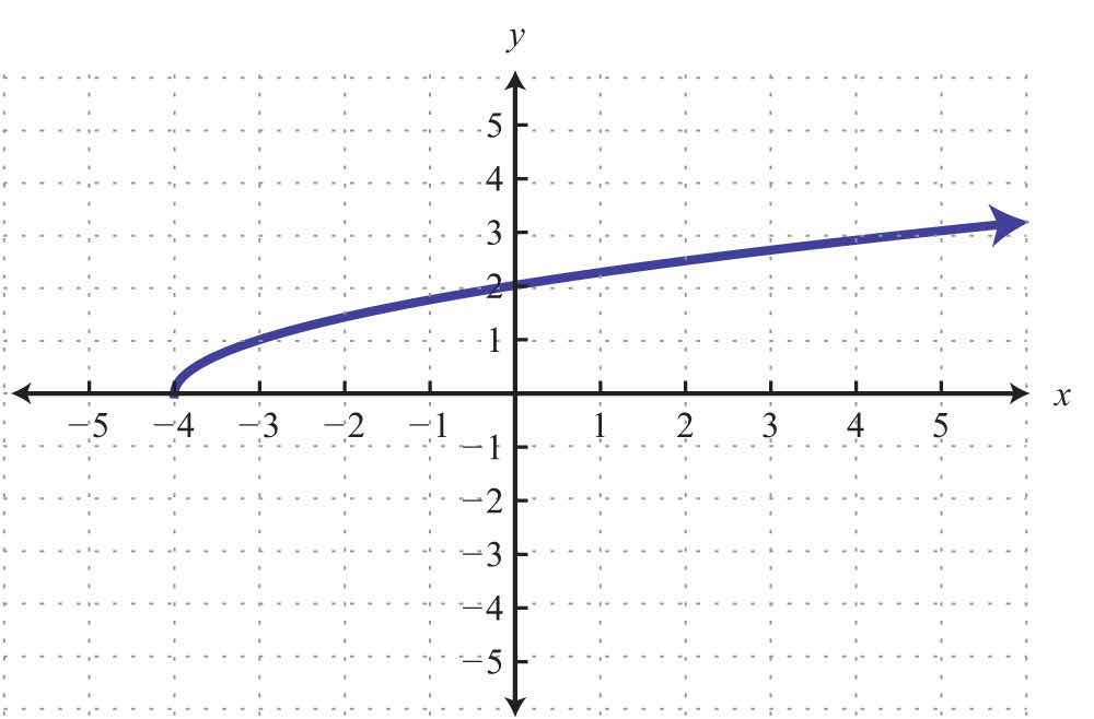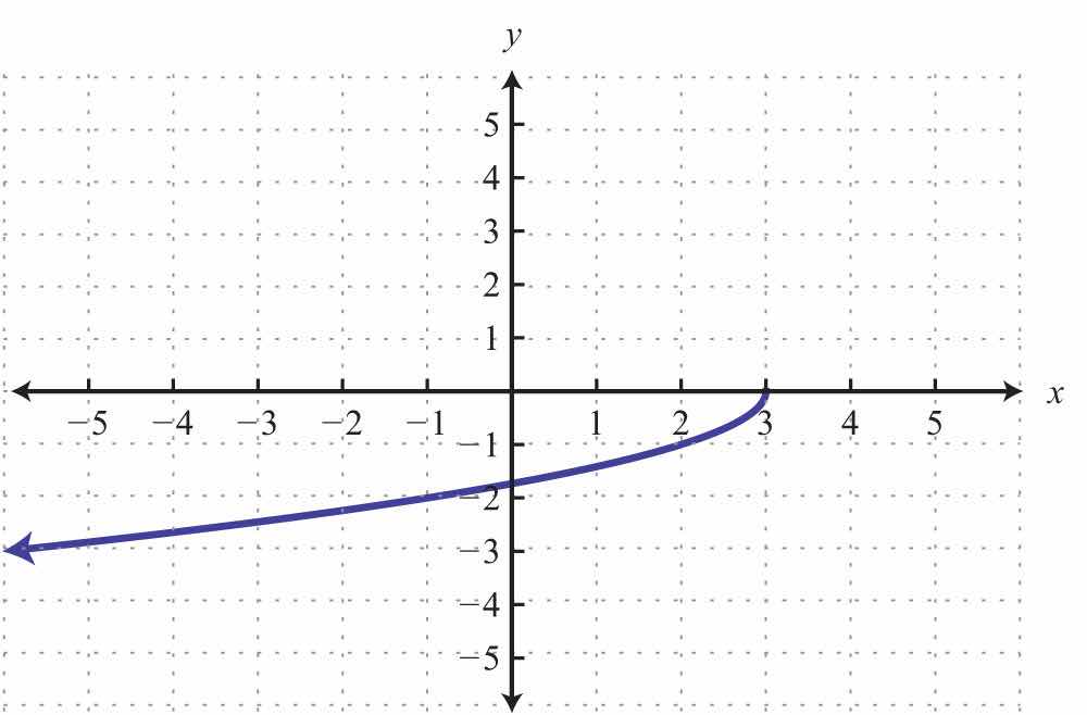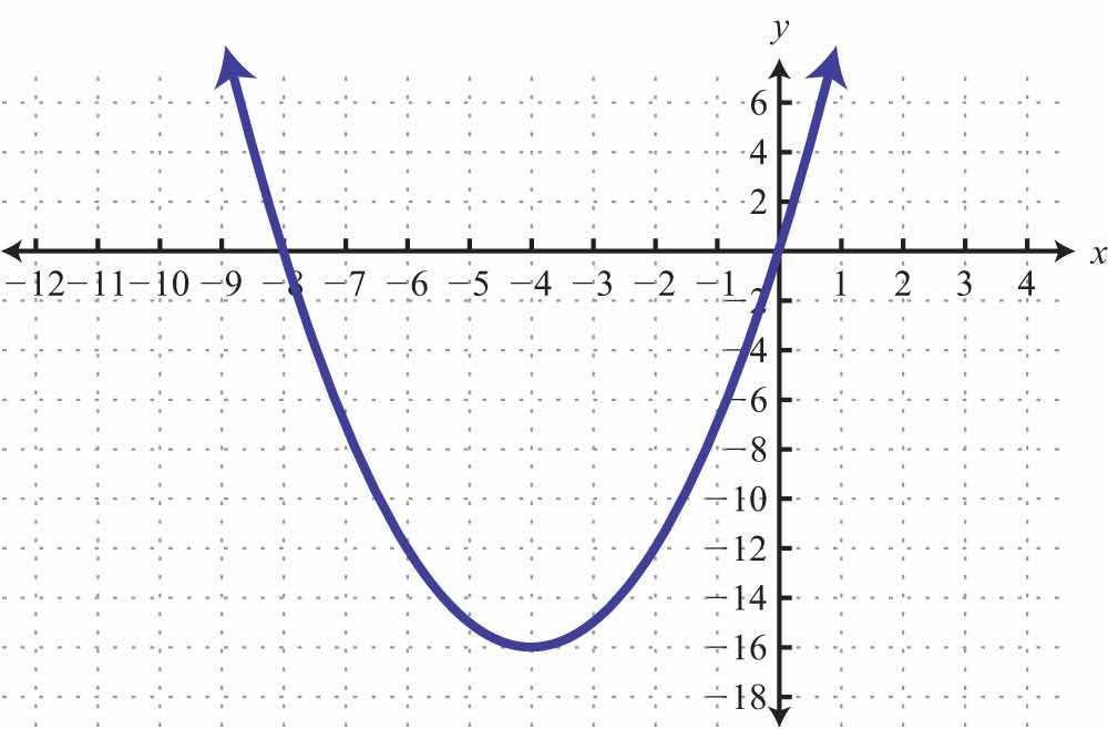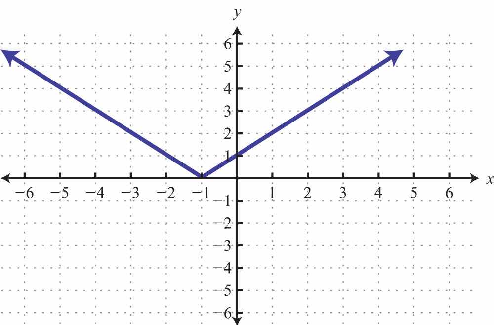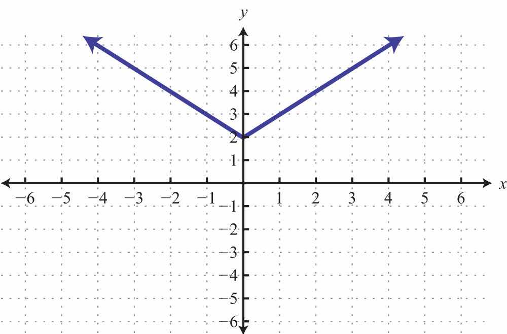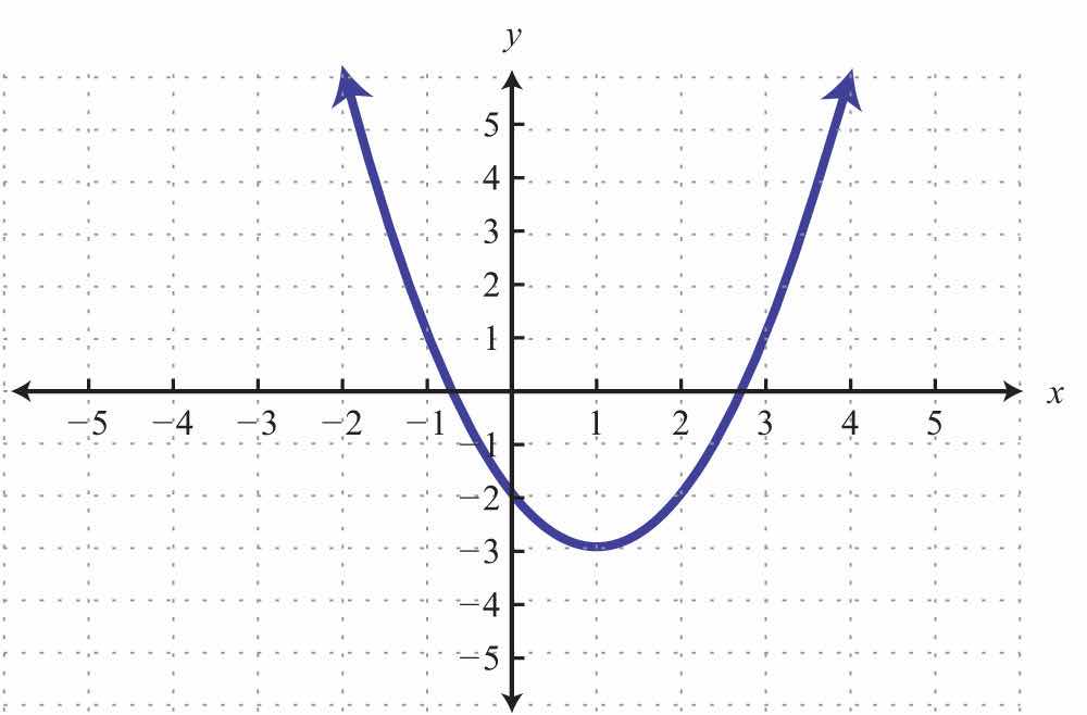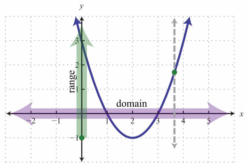 Solution: The given shape is called a parabola and extends indefinitely to the left and right as indicated by the arrows. This suggests that if we choose any x-value, then we will be able to find a corresponding point on the graph; therefore, the domain consists of all real numbers. Furthermore, the graph shows that −1 is the minimum y-value, and any y-value greater than that is represented in the relation. Hence the range consists of all y-values greater than or equal to −1, or in interval notation, .