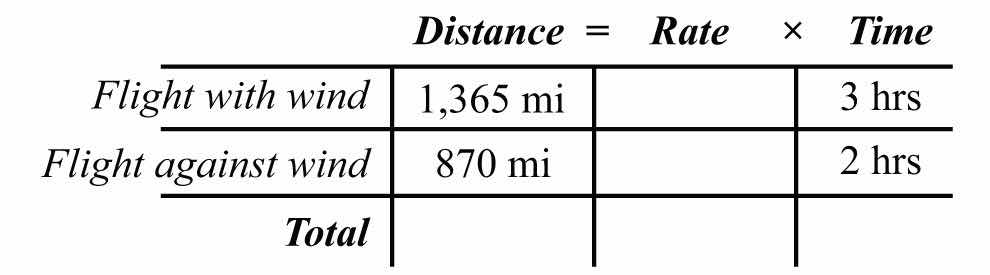 Example 8: Flying with the wind, an airplane traveled 1,365 miles in 3 hours. The plane then turned against the wind and traveled another 870 miles in 2 hours. Find the speed of the airplane and the speed of the wind.