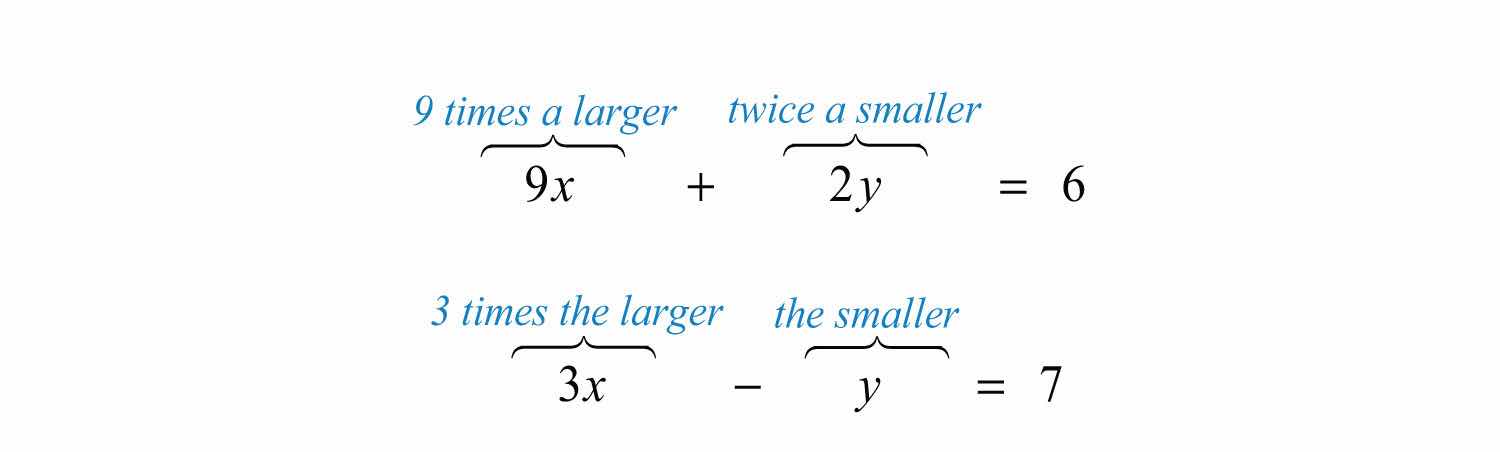 Example 2: The sum of 9 times a larger number and twice a smaller is 6. The difference of 3 times the larger and the smaller is 7. Find the numbers.