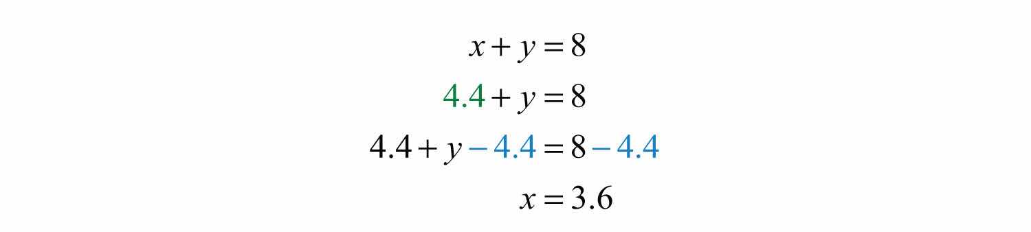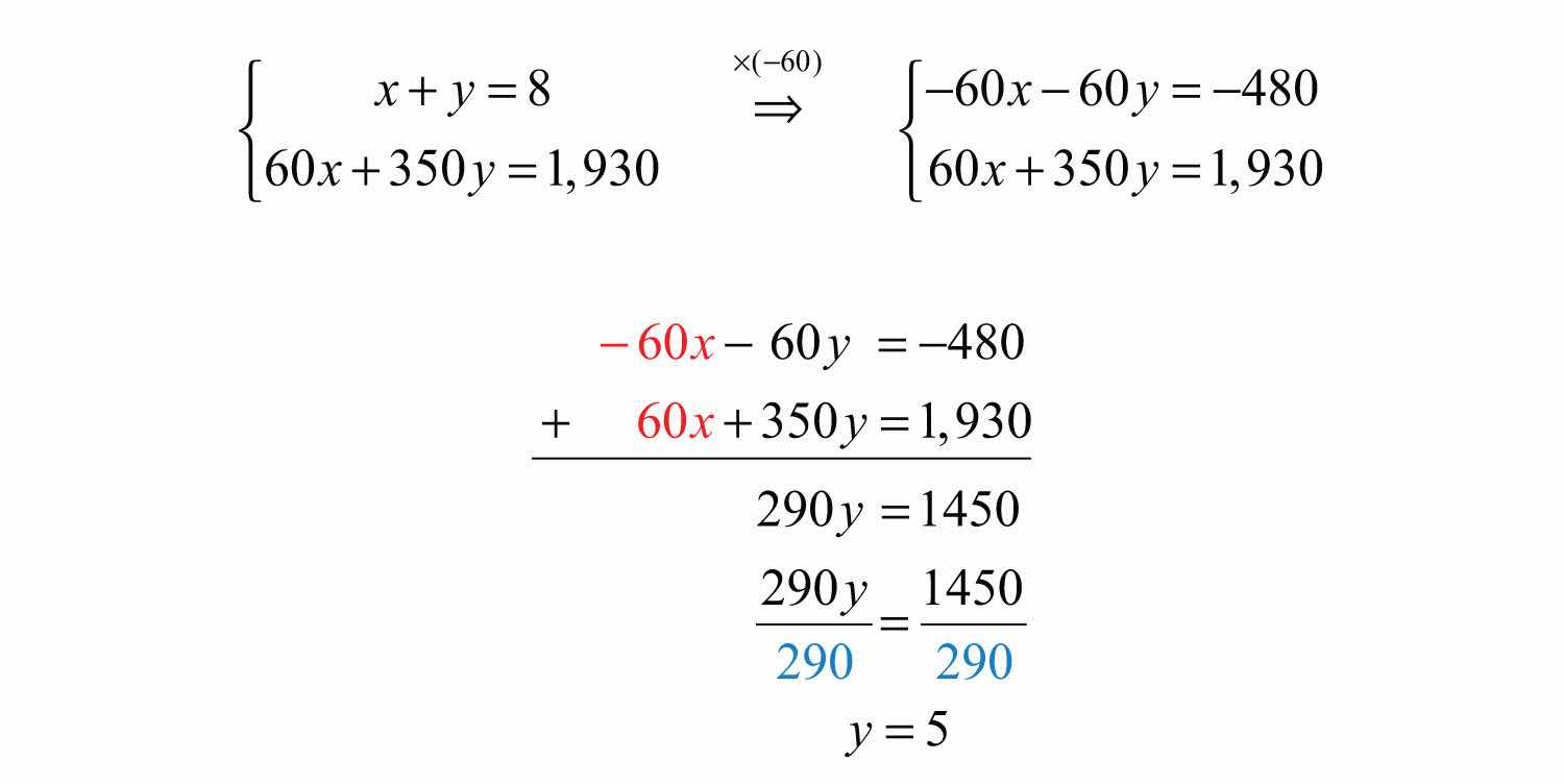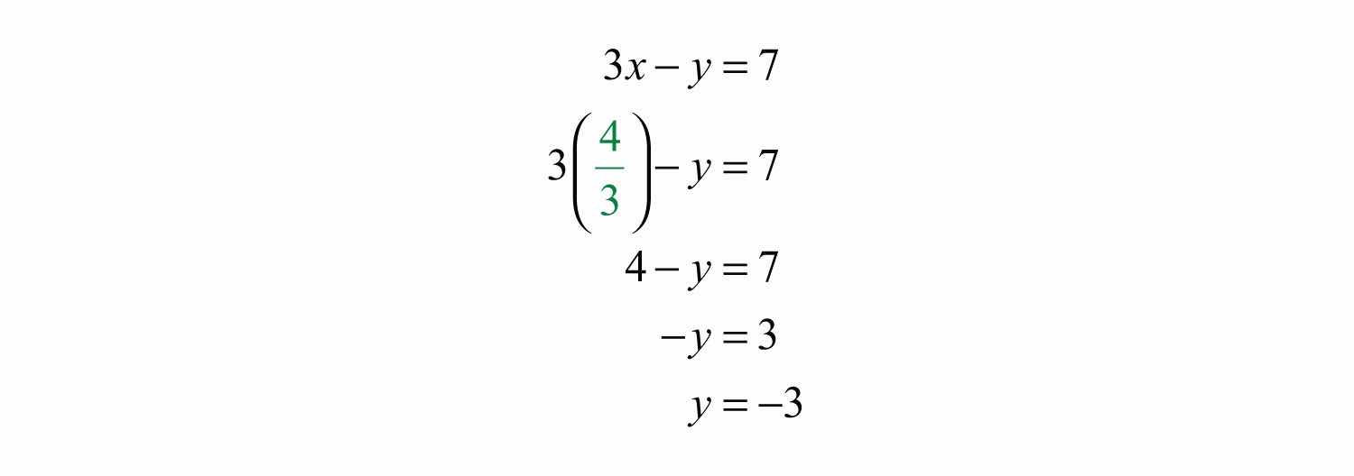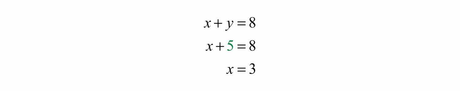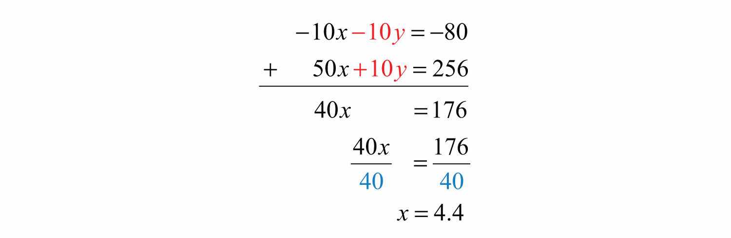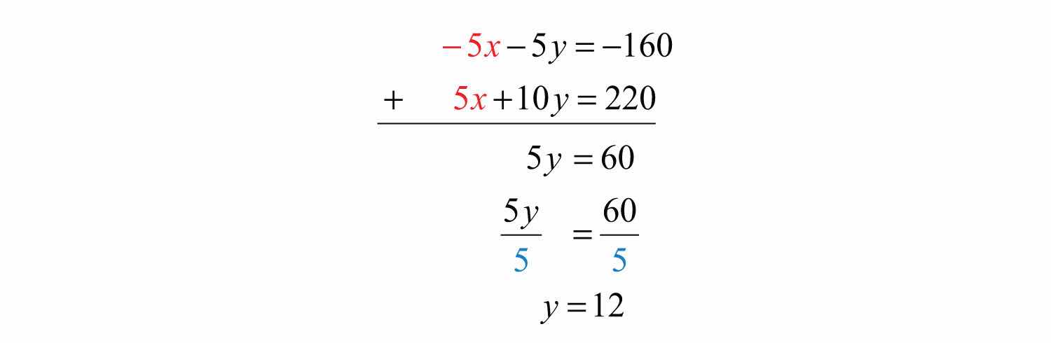 Solve: We can solve the resulting system using any method of our choosing. Here we choose to solve by elimination. Adding the equations together eliminates the variable y.