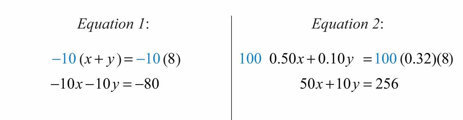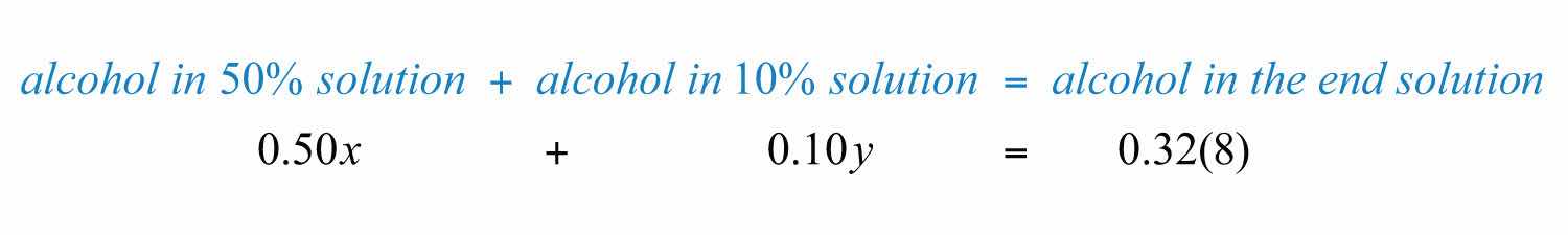 The second equation adds up the amount of alcohol from each solution in the correct percentages. The amount of alcohol in the end result is 32% of 8 ounces, or 0.032(8).