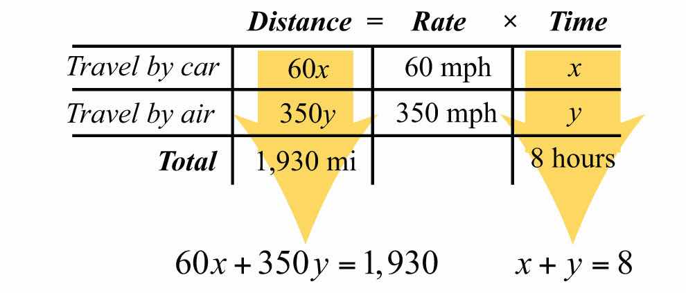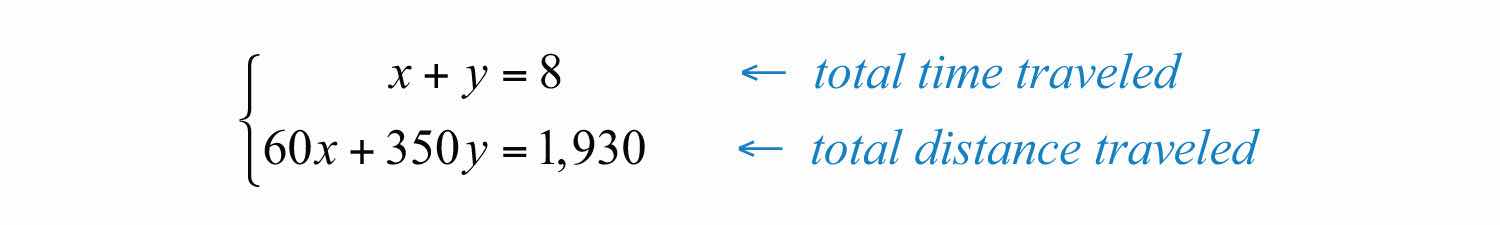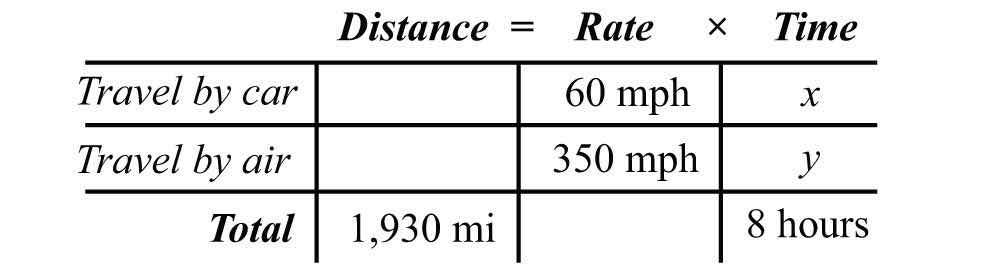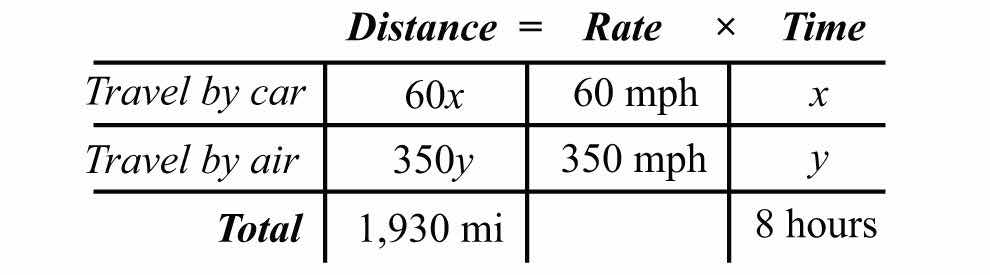 Example 7: An executive traveled a total of 8 hours and 1,930 miles by car and by plane. Driving to the airport by car, she averaged 60 miles per hour. In the air, the plane averaged 350 miles per hour. How long did it take her to drive to the airport?