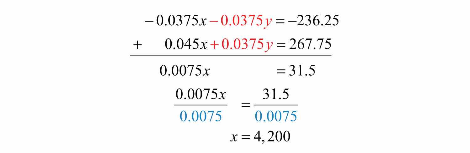 To set up a second equation, use the fact that the total interest was $267.75. Recall that the interest for one year is the interest rate times the principal (). Use this to add the interest in both accounts. Be sure to use the decimal equivalents for the interest rates given as percentages.