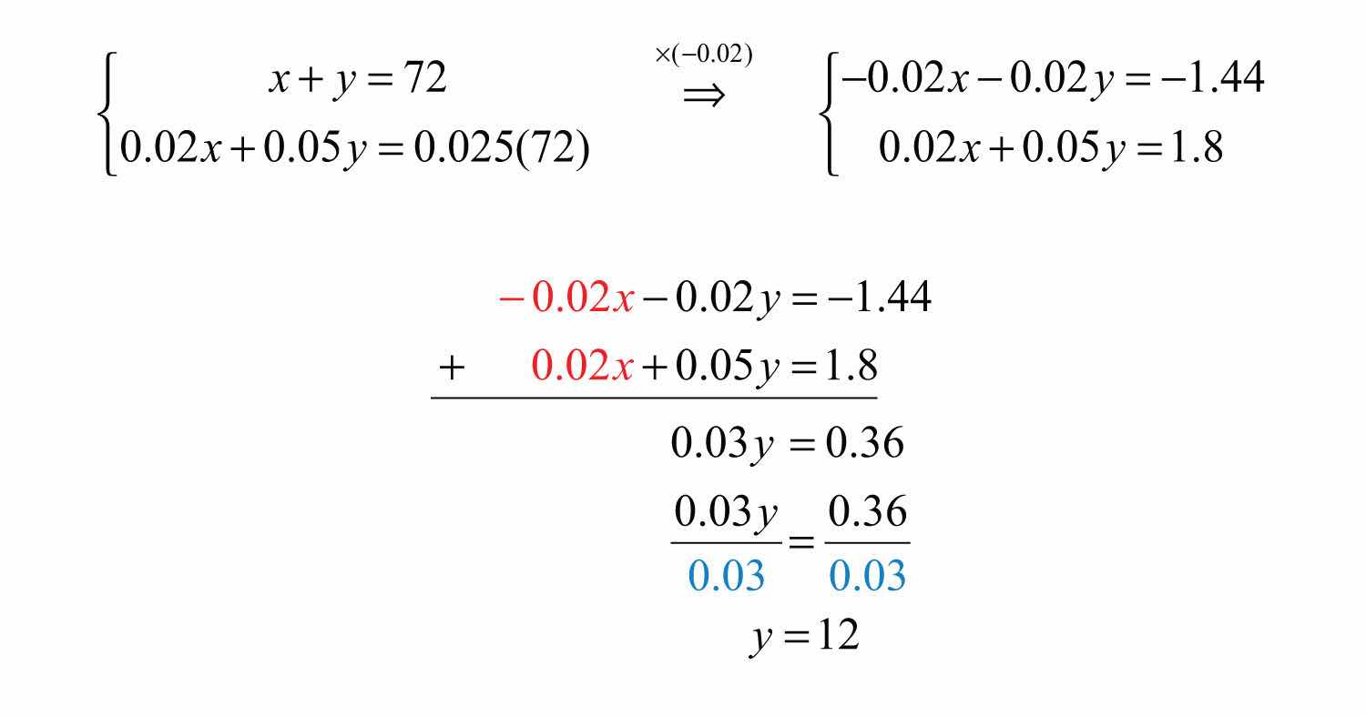 Example 5: A 2% saline solution is to be combined and mixed with a 5% saline solution to produce 72 ounces of a 2.5% saline solution. How much of each is needed?