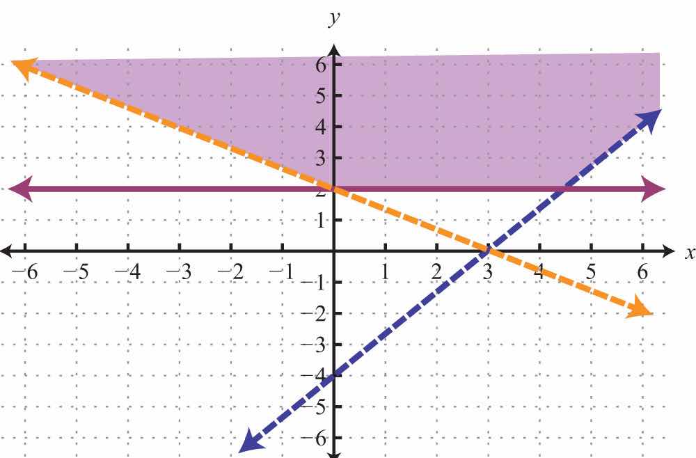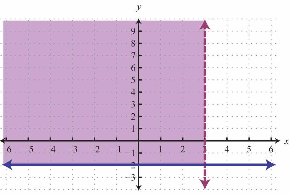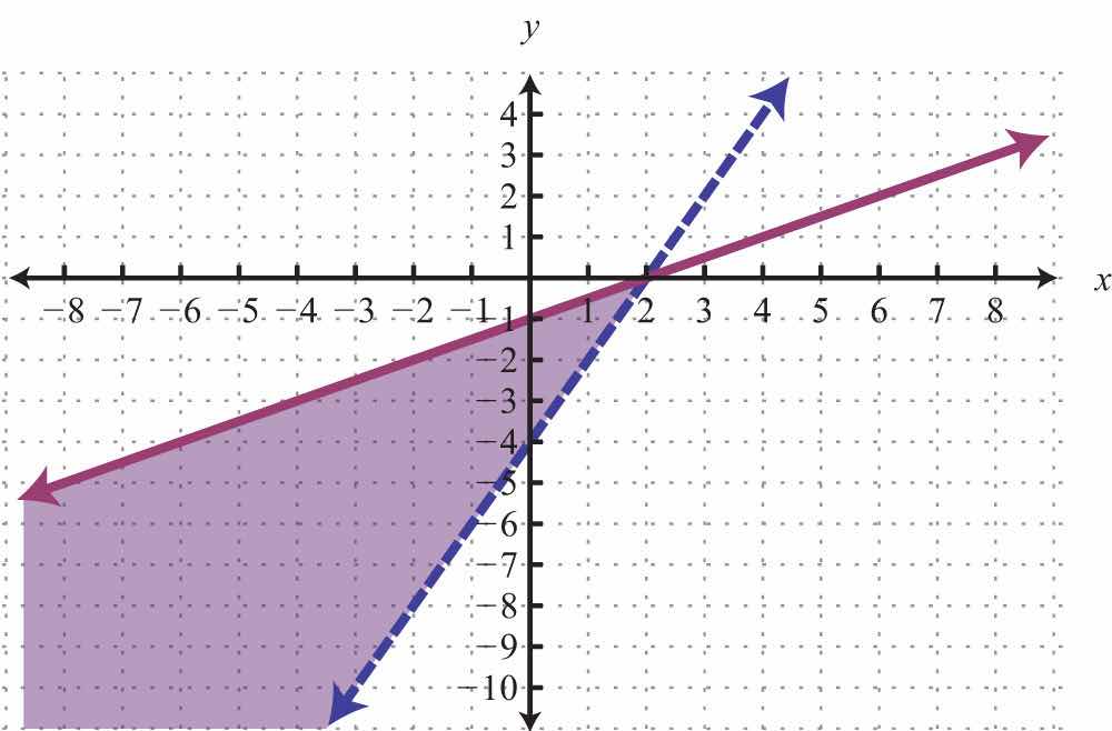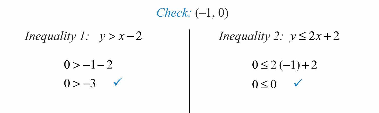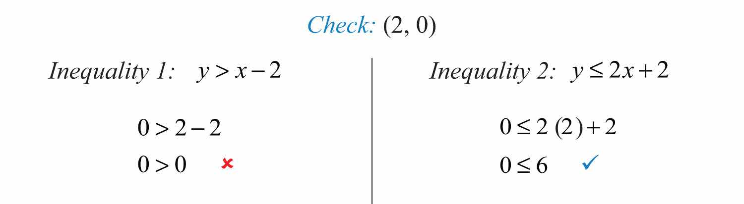 Notice that this point satisfies both inequalities and thus is included in the solution set. Now consider the point (2, 0) on the dashed boundary defined by and verify that it does not solve the original system: