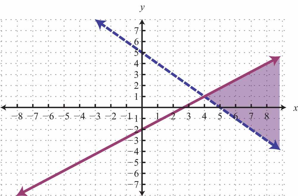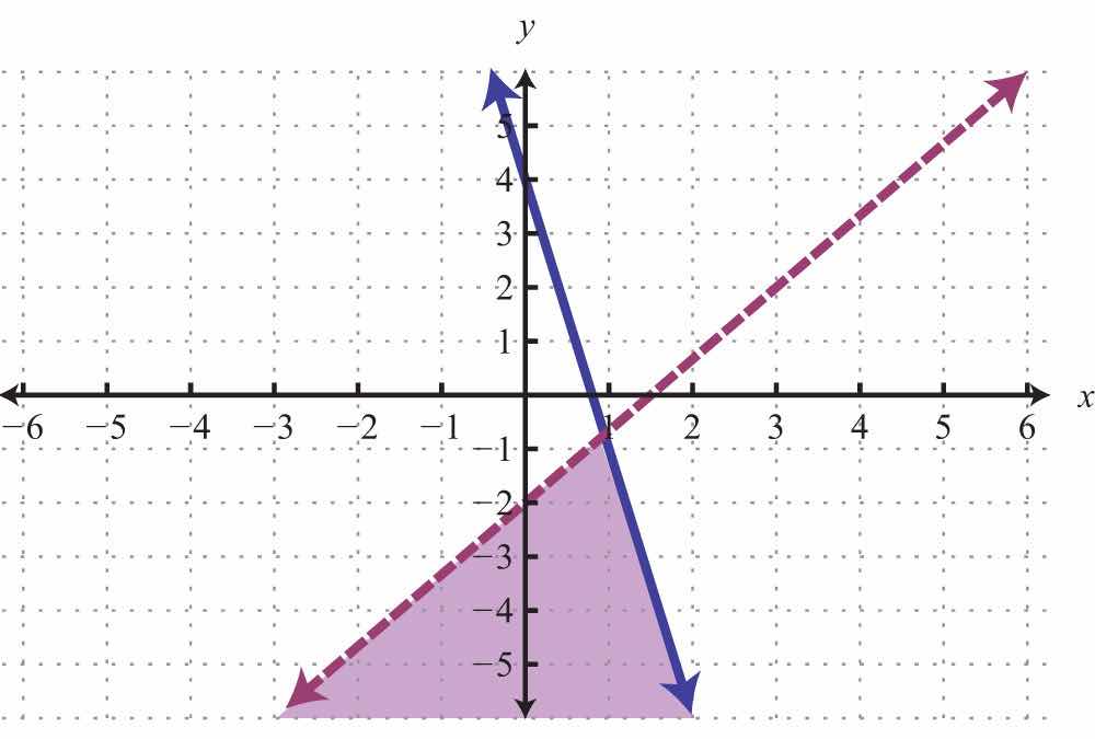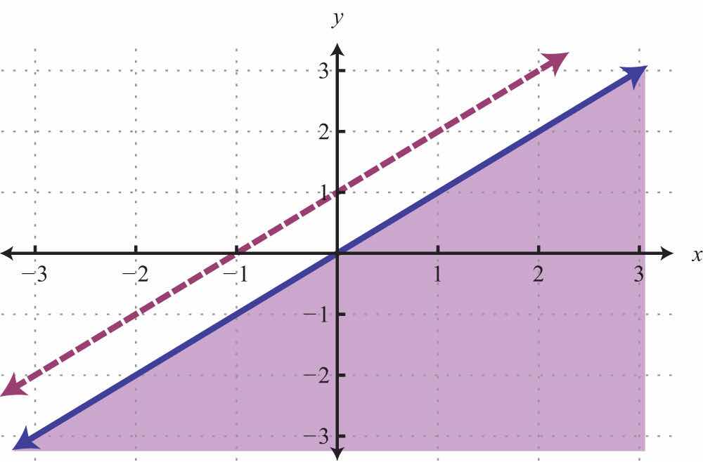 For the first inequality, we use a dashed boundary defined by and shade all points above the line. For the second inequality, we use a solid boundary defined by and shade all points below. The intersection is darkened.