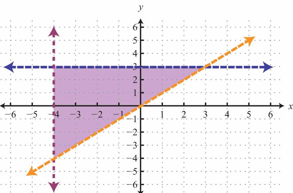 We know that each inequality in the set contains infinitely many ordered pair solutions defined by a region in a rectangular coordinate plane. When considering two of these inequalities together, the intersection of these sets defines the set of simultaneous ordered pair solutions. When we graph each of the above inequalities separately, we have