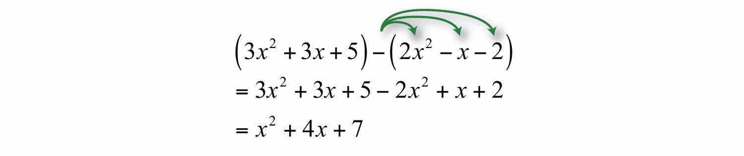 When subtracting polynomialsThe process of subtracting all the terms of one polynomial from another and combining like terms., we see that the parentheses become very important. Recall that the distributive property allowed us to derive the following: