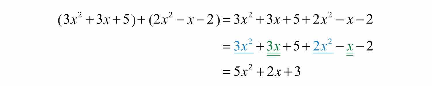 Notice that the variable part, , does not change. This, in addition to the commutative and associative properties of addition, allows us to add polynomialsThe process of combining all like terms of two or more polynomials..