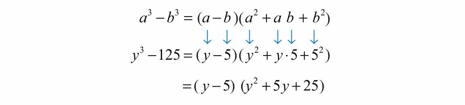 The process for factoring the sum and difference of cubes is very similar to that for the difference of squares. We first identify a and b and then substitute into the appropriate formula. The separate formulas for sum and difference of cubes allow us to always choose a and b to be positive.