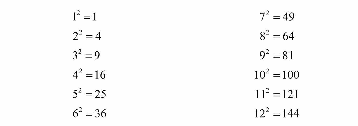 It is worth taking some extra time at this point to review all of the squares of integers from 1 to 12.