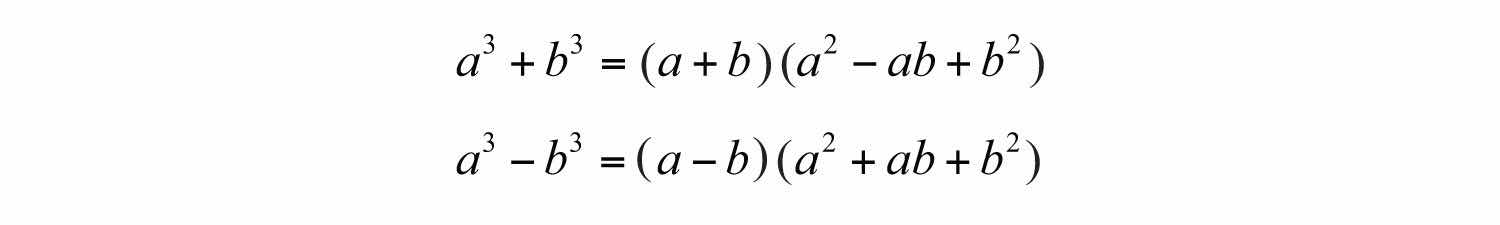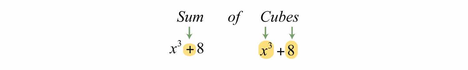 Two other special binomials of interest are the sum where a and b represent algebraic expressions. and difference of cubes where a and b represent algebraic expressions.: