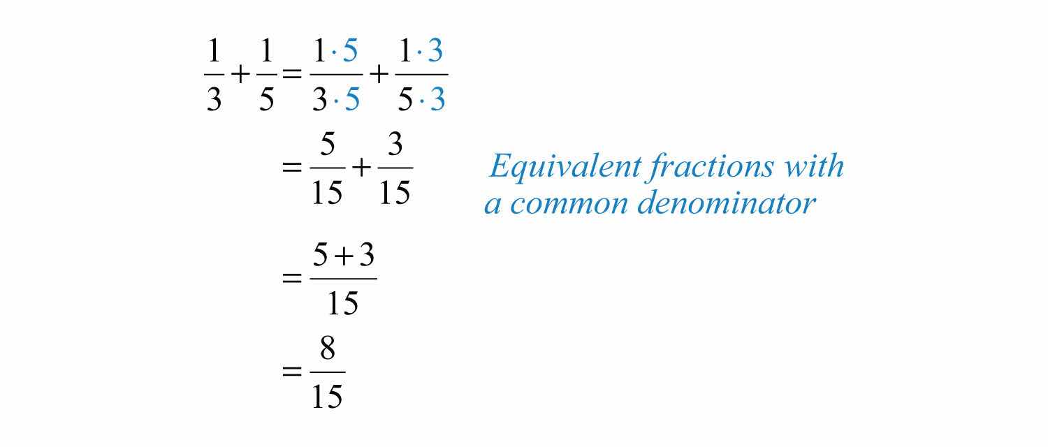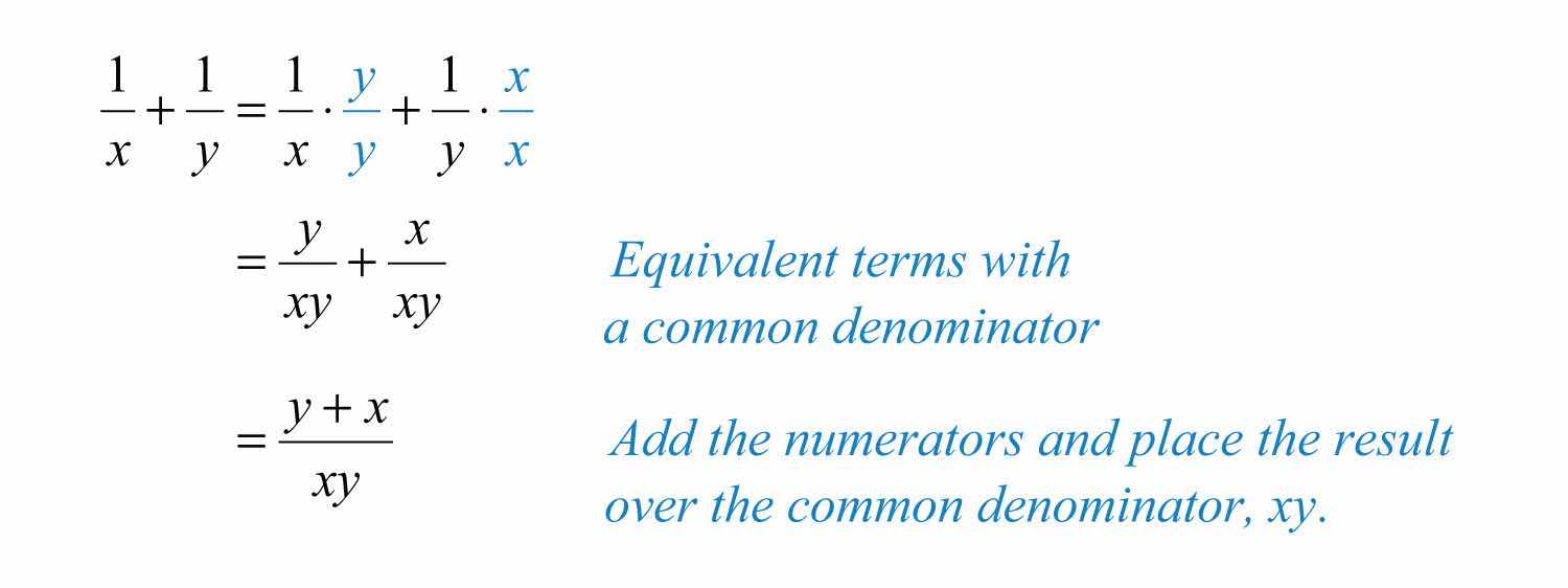 To add rational expressions with unlike denominators, first find equivalent expressions with common denominators. Do this just as you have with fractions. If the denominators of fractions are relatively prime, then the least common denominator (LCD) is their product. For example,