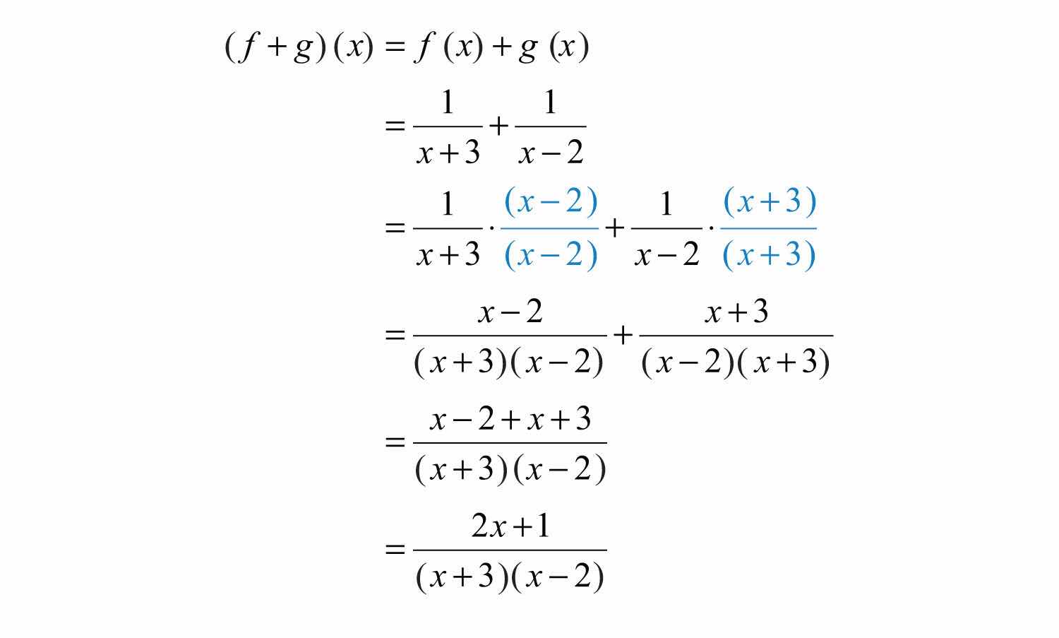 Here the domain of f consists of all real numbers except −3, and the domain of g consists of all real numbers except 2. Therefore, the domain of f + g consists of all real numbers except −3 and 2.