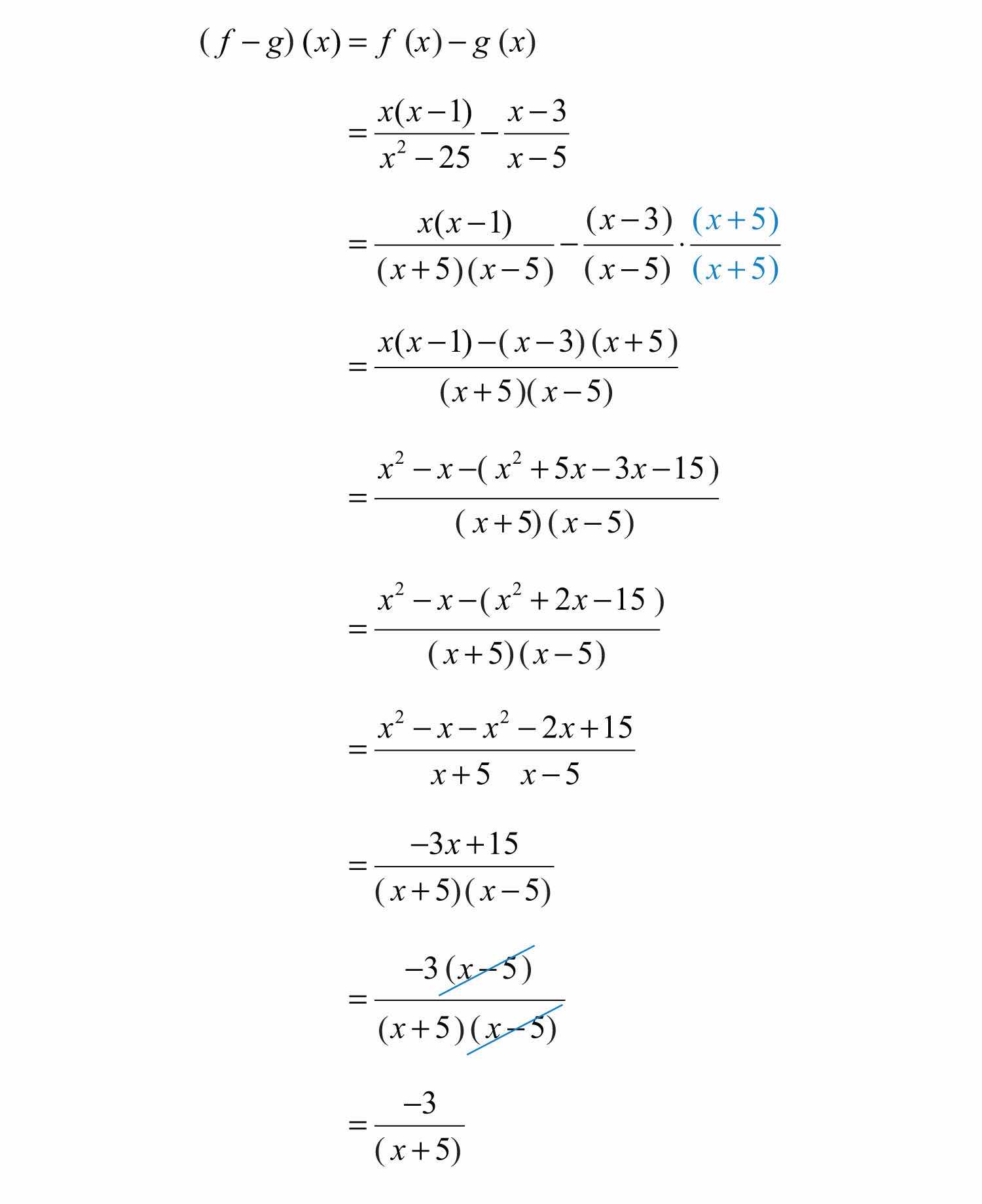 The domain of f consists of all real numbers except 5 and −5, and the domain of g consists of all real numbers except 5. Therefore, the domain of f − g consists of all real numbers except −5 and 5.