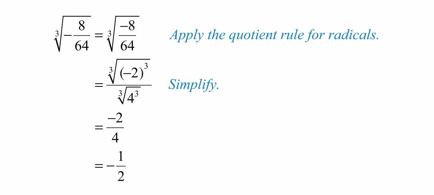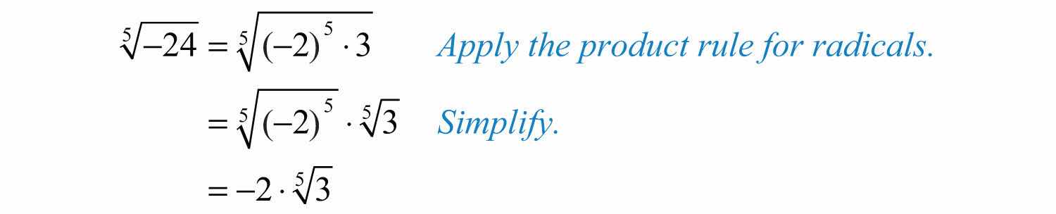 Solution: Here we note that the index is odd and the radicand is negative; hence the result will be negative. We can factor the radicand as follows: