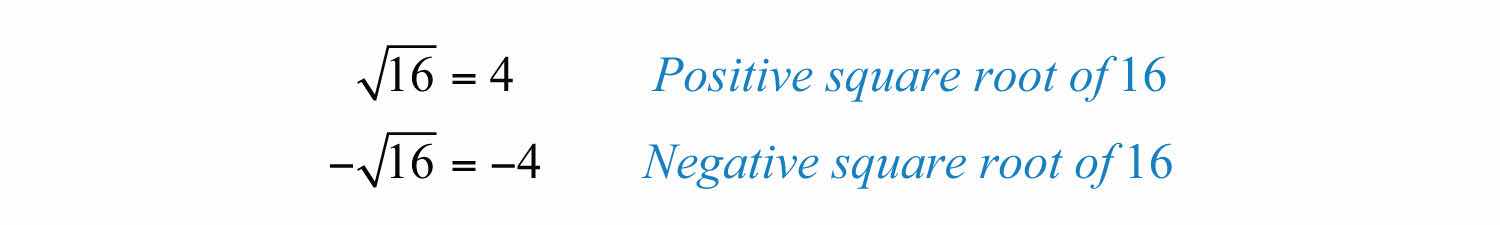 The square rootThe number that, when multiplied by itself, yields the original number. of a number is that number that when multiplied by itself yields the original number. For example, 4 is a square root of 16, because . Since , we can say that −4 is a square root of 16 as well. Every positive real number has two square roots, one positive and one negative. For this reason, we use the radical sign to denote the principal (nonnegative) square rootThe positive square root of a real number, denoted with the symbol . and a negative sign in front of the radical to denote the negative square root.