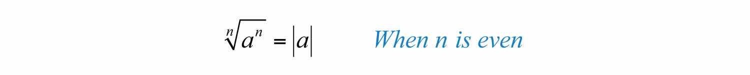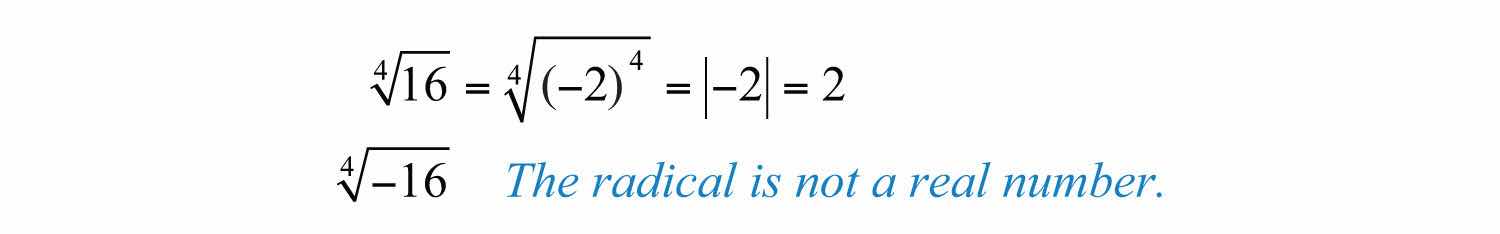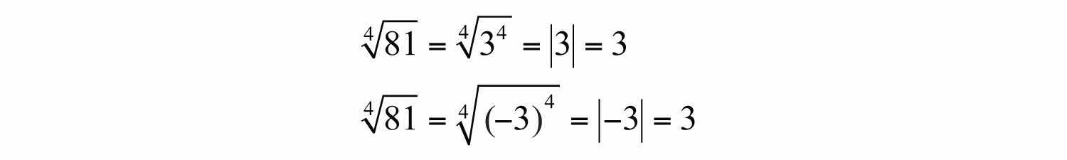We have already taken care to define the principal square root of a number. At this point, we extend this idea to nth roots when n is even. For example, 3 is a fourth root of 81, because . And since , we can say that −3 is a fourth root of 81 as well. Hence we use the radical sign to denote the principal (nonnegative) nth rootThe positive nth root when n is even. when n is even. In this case, for any real number a, we use the following property: