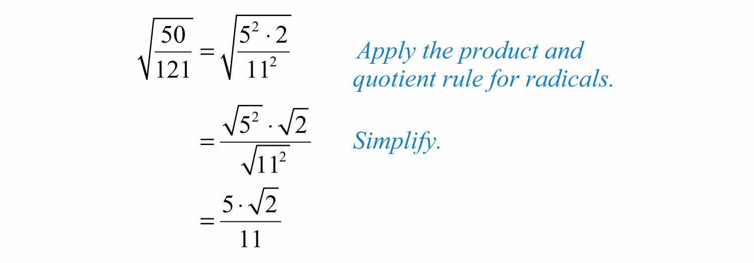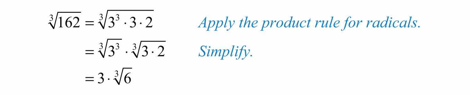 It will not always be the case that the radicand is a perfect power of the given index. If not, we use the following two properties to simplify them. If a and b represent positive real numbers, then we have
