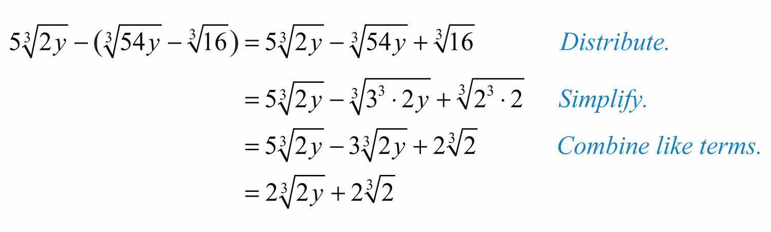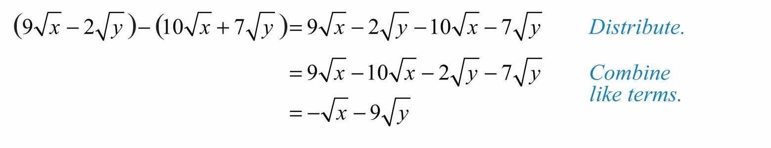 We will often find the need to subtract a radical expression with multiple terms. If this is the case, remember to apply the distributive property before combining like terms.